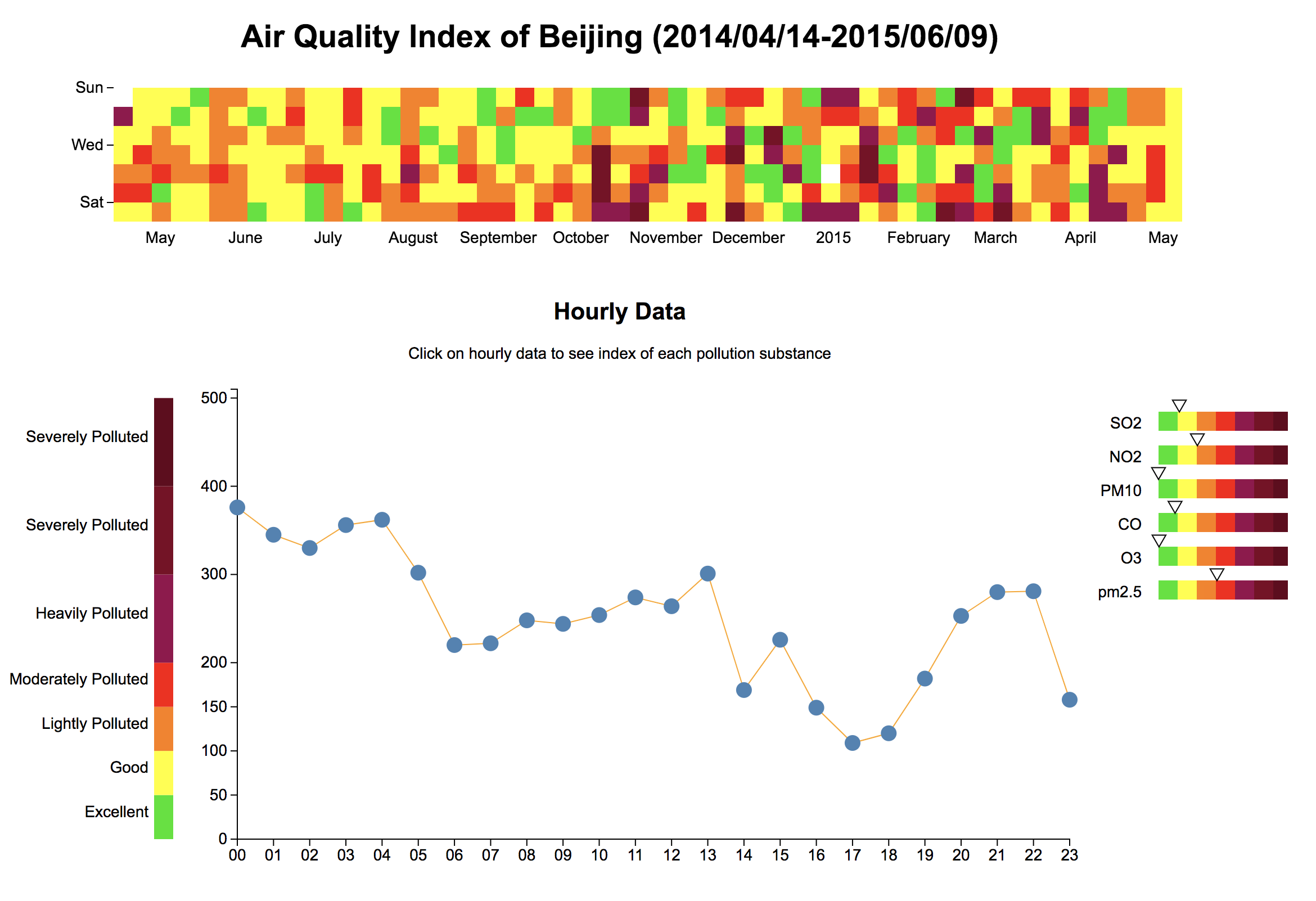 I thought the calendar view type of chart is a really nice way of showing the ‘good days’ and ‘bad days’ not only because you can get a glimpse of chances of breathing clean air but also I can use colors to indicate how severe the air pollution was on a specific day.